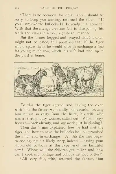 But the farmer begged and prayed that his oxen might not be eaten, and promised that if the tiger would give in exchange a fine fat young milch cow, which his wife had tied up in the yard at home.