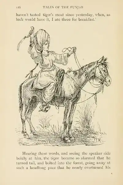 Hearing these words, and seeing the speaker ride boldly at him, the tiger became so alarmed that he turned tail, and bolted into the forest, going away at such a headlong pace that he nearly overturned his