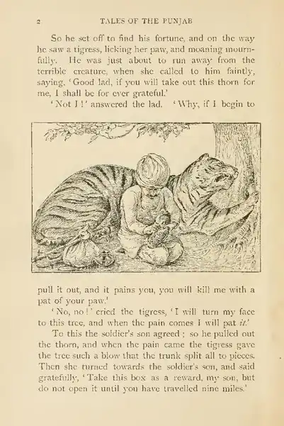 So he set off to find his fortune, and on the way he saw a tigress, licking her paw, and moaning mournfully. He was just about to run away from the terrible creature, when she called to him faintly, saying. 'Good lad, if you will take out this thorn for me, I shall be for ever grateful.'