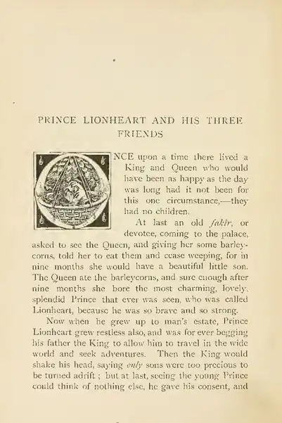 At last an old fakîr, or devotee, coming to the palace, asked to see the Queen, and giving her some barleycorns, told her to eat them and cease weeping, for in nine months she would have a beautiful little son. The Queen ate the barleycorns, and sure enough after nine months she bore the most charming, lovely, splendid Prince that ever was seen, who was called Lionheart, because he was so brave and so strong.