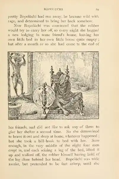 Now Bopolûchî was convinced that the robber would try to carry her off, so every night she begged a new lodging in some friend's house, leaving her own little bed in her own little house quite empty; but after a month or so she had come to the end of