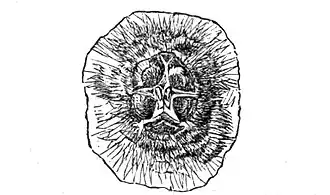 Now the Nephila plumipes possesses at least three pairs of spinners. Of these, two are much larger than the third, which indeed does not appear till they are separated. From the posterior of the two largest pairs seems to proceed the white, and from the anterior the yellow silk, while from the small intermediate pair seem to proceed very fine filaments of a pale-blue color, the use of which is to envelop the prey after it has been seized and killed, being drawn out by the bristles near the tips of the spider's hinder legs. Beside these six papillæ there is, just in front of the anterior pair, a single small papilla on the middle line, the nature and use of which I have not ascertained, though I feel quite sure that no silk comes from it. The large median papilla, just behind the posterior pair, surrounds the termination of the intestines, and through it the excrement is voided, the insect for this purpose turning back the abdomen as she hangs head downward, so that neither the web nor the spinners shall be contaminated. Now it has recently been ascertained that the minute globules with which the circles are studded, and the number of which on a web of average size is estimated at one hundred thousand, do not exist in that form when the viscid lines are first spun by the spider, but as a uniform coating of gum upon a thread; this gum, of itself and according to physical laws, soon exhibits little undulations, and then separates into the globules which have long been observed and supposed to be formed by the spider. The fact of spiders selecting the night for the construction of their webs, the difficulty of making any close observations upon them while so engaged without disturbing them, and the near approximation of the two larger pairs of spinners while the viscid line is slowly drawn out by the hind leg, have hitherto prevented my determining its exact source and manner of formation. If it comes from the anterior pair only, then one and the same organ has the power of evolving a central axis and covering it with viscid gum; and it seems less improbable that the axis is white and formed by the posterior pair, the yellow gum being spread upon it by the anterior pair, which also would then have the power to evolve this same gum at other times as an equally dry, though more elastic thread. But in either case we have only three pairs of spinners and four kinds of silk, the pale-blue fasciculi the dry white, the dry yellow, and the viscid and very elastic silk which is employed only in the circles of the web, and which often does not become yellow till after exposure to the light. Apparently the surest method of investigation will be carefully to destroy one pair of spinners at a time without injuring the others, and then note the effect upon the spinning.
