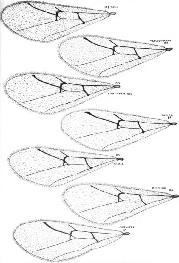 FIGS. 81-87. WINGS, EUROPEAN SUBGENUS CYNIPS