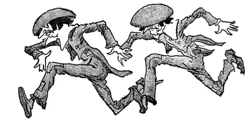 houses and down cellars, creeping into barrels and hiding themselves behind trees,—so that when Piecer and Scrapper issued from the palace not a person was in sight. They had carefully swept up Queen Cross Patch and hung her in a closet, and now, grumbling a little—for choosing a new sovereig:: was always a troublesome matter — they stepped