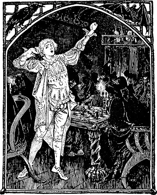 he must wait, and after several hours the sixty hooded and shrouded figures re-appeared, and conducted him with great ceremony, and also very very slowly, to a banqueting hall, where they all placed themselves at a long table. The dishes were arranged down the centre