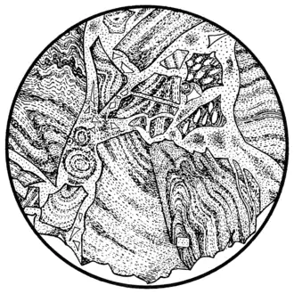 structure, etc., in great perfection, although all trace of the original glass has long since disappeared. The rocks collected by Professor Bayley on the north side of Vinal Haven and on the opposite shore west of North Haven are, according to his field observations, all surface flows or tuffs. Of the nine specimens kindly submitted to me for examination by Professor Bayley, one is a medium grained microgranite and all the others