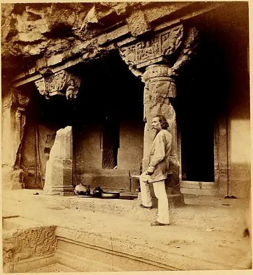 There is also a verandah in front, supported by two pillars with bracket capitals. The sculpture of these is bold and free, resembling that of the capitals in the interior of Cave No. 19, though somewhat better executed. Unfortunately, like everything in this Cave, the façade is a good deal ruined from flaws and faults in the rock.