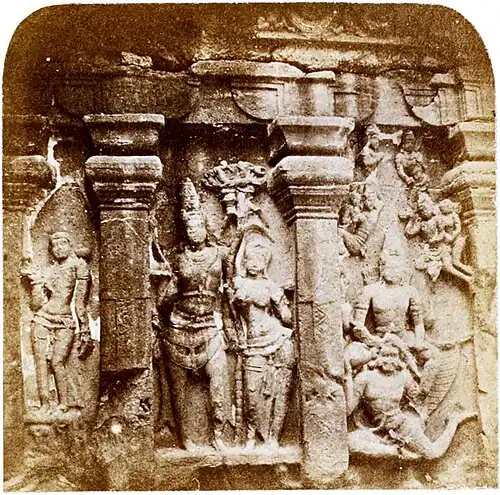 The central group represents Vishnu and his consort, Sareswati, while the figure on the left seems merely to be an attendant.