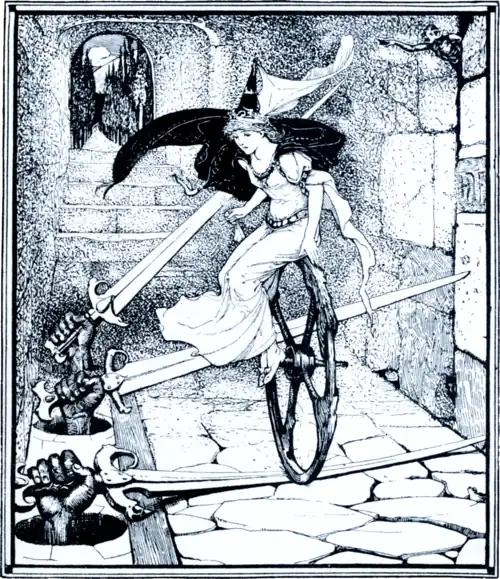 ‘Then she reached the three cutting swords, and got on her plough-wheel and rolled over them’