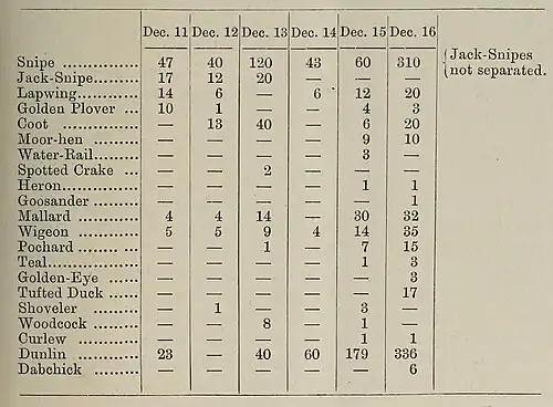 Mr. Arthur Patterson, writing from Yarmouth, and giving a description of the hard weather and its effects, says:—"Dec. 14th, birds are plentiful; yesterday crowds on Breydon Broad. Snipe rushed in after the snow; on the 10th they invaded the marshes, and on the 11th began to appear in Yarmouth Market," where the chief salesman, Mr. Durrant, gave Mr. Patterson the following particulars from his week-book of birds bought. This table could be compared with that given by Mr. Stevenson in 'The Zoologist' for 1880, p. 326, which is equally interesting.