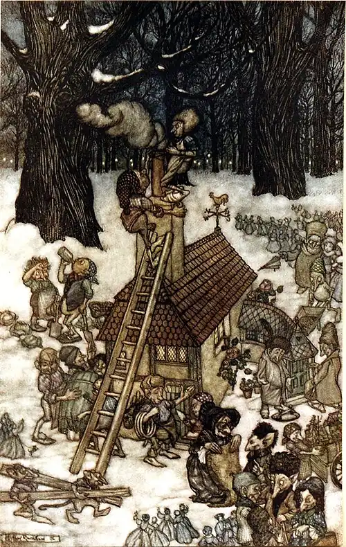 And the little house? Every lawful night (that is to say, every night except ball nights) the fairies now build the little house lest there should be a human child lost in the Gardens, and Peter rides the marches looking for lost ones, and if he finds them he carries them on his goat to the little house, and when they wake up they are in it, and when they step out they see it. The fairies build the house merely because it is so pretty, but Peter rides round in memory of Maimie, and because he still loves to do just as he believes real boys would do.