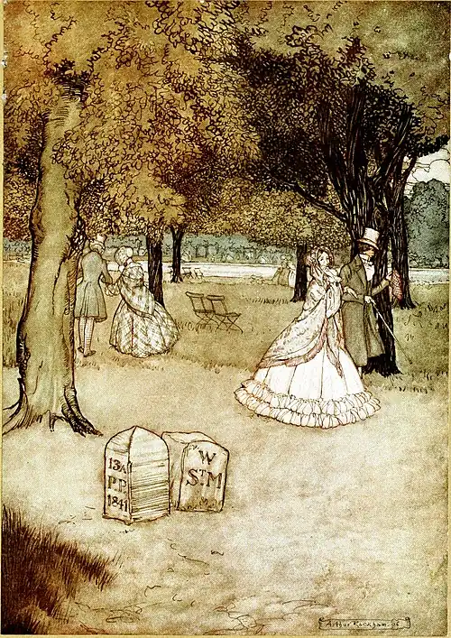 But you must not think that, because somewhere among the trees the little house is twinkling, it is a safe thing to remain in the Gardens after Lock-out time. If the bad ones among the fairies happen to be out that night they will certainly mischief you, and even though they are not, you may perish of cold and dark before Peter Pan comes round. He has been too late several times, and when he sees he is too late he runs back to the Thrush’s Nest for his paddle, of which Maimie had told him the true use, and he digs a grave for the child and erects a little tombstone, and carves the poor thing’s initials on it. He does this at once because he thinks it is what real boys would do, and you must have noticed the little stones, and that there are always two together. He puts them in twos because they seem less lonely. I think that quite the most touching sight in the Gardens is the two tombstones of Walter Stephen Matthews and Phœbe Phelps. They stand together at the spot where the parish of Westminster St. Mary’s is said to meet the parish of Paddington. Here Peter found the two babes, who had fallen unnoticed from their perambulators, Phœbe aged thirteen months and Walter probably still younger, for Peter seems to have felt a delicacy about putting any age on his stone. They lie side by side, and the simple inscriptions read—