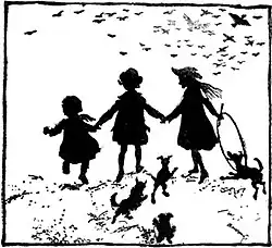 She leapt into his arms, so that it was a sort of fairy wedding, and then she hurried away. Oh, how she hastened to the gates! Peter, you may be sure, was back in the Gardens that night as soon as Lock-out sounded, but he found no Maimie, and so he knew she had been in time. For long he hoped that some night she would come back to him; often he thought he saw her waiting for him by the shore of the Serpentine as his bark drew to land, but Maimie never went back. She wanted to, but she was afraid that if she saw her dear Betwixt-and-Between again she would linger with him too long, and besides the ayah now kept a sharp eye on her. But she often talked lovingly of Peter, and she knitted a kettle-holder for him, and one day when she was wondering what Easter present he would like, her mother made a suggestion.