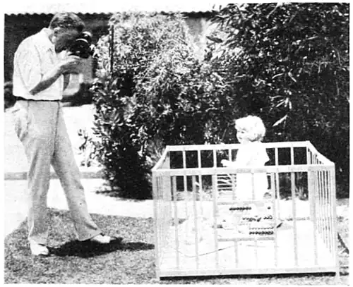 Fred Niblo, the professional photoplay director of Metro-Goldwyn, is an enthusiastic amateur. Here he is filming his daughter with his Eyemo in her playground backyard