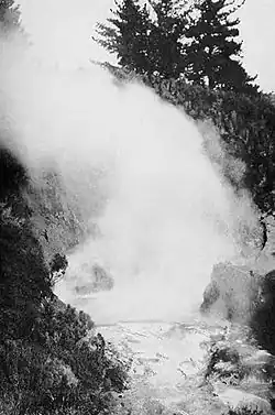 Below the Eagle's Nest was the Prince of Wales Feathers, which we forced to play by damming a rivulet and at the same time removing a dam from an adjoining stream. For twenty-five minutes its two plumes, leaping from small openings in the side of a terrace, played from twenty-five to thirty feet high. Below it was an indicating splasher which always erupted a few minutes before the Feathers began throwing.
