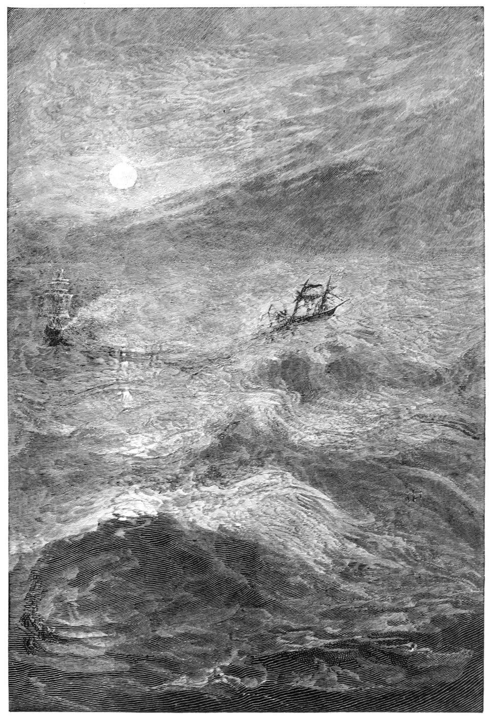 Beneath the low-hung night cloud That raked her splintering mast, The good ship settled slowly, The cruel leak gained fast. ****** And ship to ship made signals, Man answered back to man, While oft, to cheer and hearten, The Three Bells nearer ran. The Three Bells.