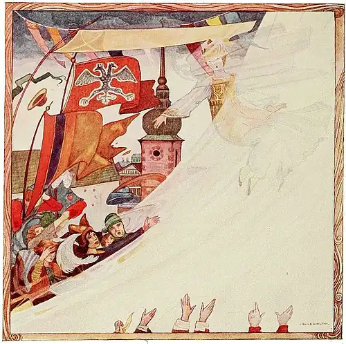 As the young couple, with all their followers and their guests, were leaving the palace to go to church, a violent wind began to blow, a regular whirlwind, raising a column of sand, and lifting the princess off her feet. She was carried up over the clouds, to the top of some inaccessible mountains, and dropped down into a magnificent palace, with a golden roof, and a high wall all round.