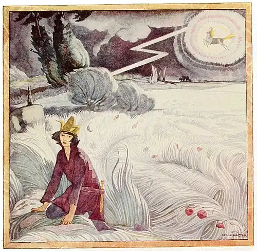 So the prince crept in at the horse's left ear, and came out again at the right one, all clad in golden armour. He also found himself miraculously increased in strength, so that when he stamped on the ground it trembled; and when he shouted a storm arose, which shook the leaves from the trees.