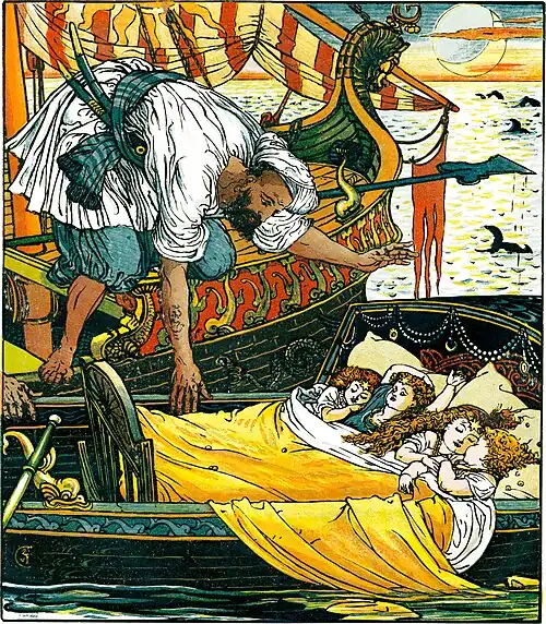 So she had a boat brought round to the beach, and put the four babes, with some strings of jewels, into a cradle, which she placed in the boat, and then set it adrift. The boat was soon far out at sea. The waves rose, the rain poured in torrents, and the thunder roared. Feintise could not doubt that the boat would be swamped, and felt relieved by the thought that the poor little innocents would perish, for she would otherwise always be haunted by