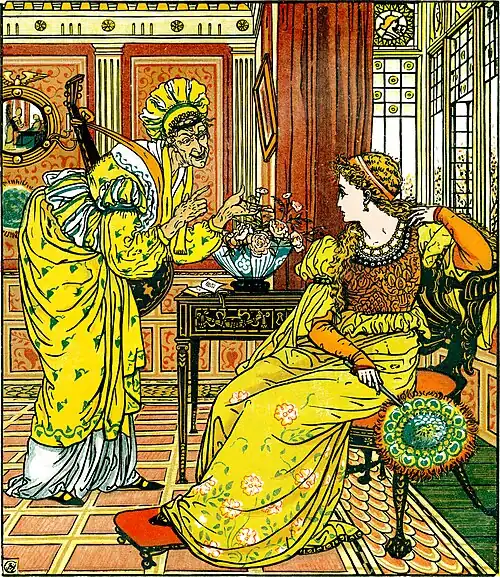 Old Feintise learned from her spies that Cheri had returned, and that the Princess, having washed her face with the dancing-water, had become more lovely than ever. Finding this, she lost no time in artfully making the Princess sigh for the wonderful singing-apple. Prince Cheri again found her unhappy, and again found out the cause, and once more set out on his white horse, leaving a letter for Belle-Etoile.
