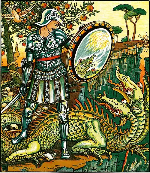 Prince Cheri at break of day perceived a handsome young man, from whom he learned where the singing-apple was to be found: but after travelling some time without seeing any sign of it, he saw a poor turtle-dove fall at his feet almost dead. He took pity on it, and restored it, when it said, "Good-day, handsome Cheri, you are destined to save my life, and I to do you signal service. You are come to seek for the singing-apple: it is guarded by a terrible dragon." The Dove then led him to a place where he found a suit of armour, all of glass: and by her advice he put it on, and boldly went to meet the dragon. The two-headed monster came bounding along, fire issuing from his throat; but when he saw his alarming figure multiplied in the Prince's mirrors he was frightened in his turn. He stopped, and looking fiercely at the Prince, apparently laden with dragons, he took flight and threw himself into a deep chasm. The Prince then found the tree, which was surrounded with human bones, and breaking off an apple, prepared to return to the Princess. She had never slept during his absence, and ran to meet him eagerly.