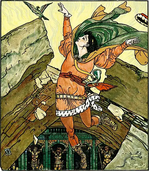 Cheri again set out, and after some trouble learnt that this bird was to be found on the top of a frightful rock, in a frozen climate. At length, at dawn of day, he perceived the rock, which was very high and very steep, and upon the summit of it was the bird, speaking like an oracle, telling wonderful things. He thought that with a little dexterity it would be easy to catch it, for it seemed very tame. He got off his horse, and climbed up very quietly. He was so close to the green bird that he thought he could lay hands on it, when suddenly the rock opened and he fell into a spacious hall, and became as motionless as a statue; he could neither stir, nor utter a complaint at his deplorable situation. Three hundred knights, who had made the same attempt, were in the same state. To look at each other was the only thing permitted them.