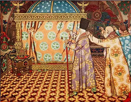 "Dry thy tears, little master," said the other, "for I can assist thee. This is not, after all, the hardest service. Go thou to the Tzar and ask for two handkerchiefs cunningly embroidered in gold, a silken tent woven with gold thread and with golden tent-poles, gold and silver dishes, and all manner of wines and sweetmeats."