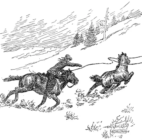 Smoky had no chance to hide, and as he seen the bow-legged humans uncoil long ropes and heard the loops whiz past him at the speed of a bullet, terror struck in his heart and he was ready to leave the earth. He heard some of the colts squeal as they was snared, throwed, and tied down, and that sure didn’t help to ease the fear that’d took hold of him.