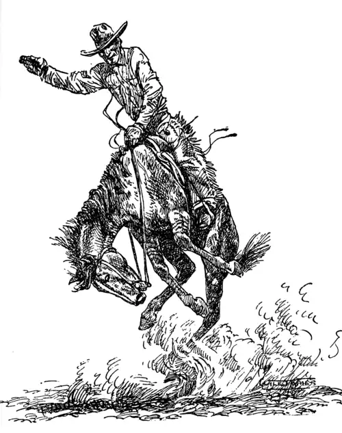 wenty feet of rope is laying between the cowboy’s hand and the pony’s head. The cowboy is standing there just watching and smiling some at the surprised look that’s in the pony’s face, that pony had just been stopped sudden in his bucking with an empty saddle. It was the first time a saddle had been on his slick back and it was no wonder he tried to get out from under that thing; nothing had ever clung there before.