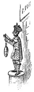 Then there was Sir Walter Rosettes, a long-bodied little man in a cavalier’s cloak, with a ruff about his neck and enormous rosettes on his shoes, who stood on a pedestal at old Mrs. Peevy’s garden gate, offering an imitation tobacco-plant, free of charge, as it were, to anyone who would take the trouble of carrying it home. This bold device was intended to call attention to the fact that Mrs. Peevy kept a tobacco-shop in the front parlor of her little cottage behind the hollyhock bushes, the announcement being backed up by the spectacle of three pipes arranged in a tripod in the window, and by the words “Smokers’ Emporium” displayed in gold letters on the glass; and, by the way, Dorothy knew perfectly well who this little man was, as somebody had taken the trouble of writing his name with a lead-pencil on his pedestal just below the toes of his shoes.