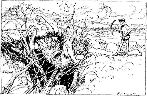 In those days the Mount of Cornwall was kept by a huge giant named Cormoran. He was eighteen feet in height, and about three yards round the waist, of a fierce and grim countenance, the terror of all the neighbouring towns and villages. He lived in a cave in the midst of the Mount, and whenever he wanted food he would wade over to the mainland, where he would furnish himself with whatever came in his way. Everybody at his approach ran out of their houses, while he seized on their cattle, making nothing of carrying half a dozen oxen on his back at a time; and as for their sheep and hogs. he would tie them round his waist like a bunch of tallow-dips, He had done this for many years, so that all Cornwall was in despair.