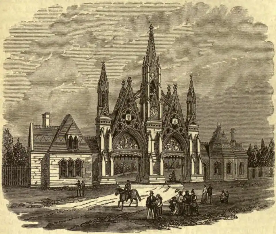 —Greenwood cemetery, widely noted for its natural and artificial beauties, is on Gowanus heights in the S. part of the city. It was opened for interments in 1842, and contains 413 acres, about one half of which is covered with wood of natural growth. The entire cost of the land was $281,684. At the main entrance, near 5th avenue and 23d street, is a highly ornamental structure of brown stone, monumental in form, in the middle pointed English Gothic style, 132. ft. long and 40 ft. deep, the central pinnacle being 106 ft. high. It is ornamented with figures representing scenes from the Gospels, chief of which are the entombment and the resurrection of the Saviour. The grounds have a varied surface of hill, valley, and plain, and are traversed by 17 m. of carriage roads and 15 m. of foot paths. The elevations afford extensive views. Greenwood contains many beautiful monuments, chief among which are the pilots' and firemen's monuments, the soldiers' monument (unfinished), erected by the city of New York, and that to the memory of Miss Canda. In 1871 the total number of interments had been 154,803. The Cypress Hills cemetery, about a mile east of the city limits, beyond East New York, occupies an elevated ridge of land, and contains nearly 400 acres, about one half of which is improved. The cemetery is beautifully arranged, and affords fine views of the surrounding country. More than 70,000 persons have been interred here. In the soldiers' plot are buried the bodies of 4,000 soldiers. The cemetery of the Evergreens, incorporated in 1849, near Bushwick, contains 207 acres, of which 60 are within the city limits. The Citizens' Union cemetery, between Butler and Sackett streets and Rochester and Ralph avenues, contains 10 acres, and is designed as a burial place for colored persons. The cemetery of the Holy Cross at Flatbush contains 36 acres, and is the principal Roman Catholic burying ground. Other cemeteries in the vicinity are Calvary (Catholic), on Laurel Hill, Queens county; Mount Olivet, near Maspeth; Washington, 1½ m. S. of Greenwood; the Friends' cemetery, near the city line, S. of Greenwood; and the Lutheran, between Cypress Hills and Mount Olivet. Nearly all the interments from New York are made in these cemeteries in and around Brooklyn.—Brooklyn is connected with New York by 12 steam ferries, belonging to five companies. The Greenpoint company runs two lines from the foot of Greenpoint avenue, the one to the foot of 10th, the other to the foot of 23d street, New York. The Houston street associates run a ferry from the foot of Grand street, Eastern District, to the foot of Houston street, New York. The New York and Brooklyn company runs lines from the foot of Bridge street, Brooklyn, to James slip, New York; from the foot of Broadway (formerly S. 7th street), Eastern District, to Grand and to Roosevelt streets, New York; and from the foot of Grand street, Eastern District, to Grand street, New York.