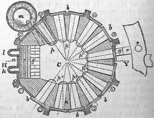| A, shaft of the furnace; B, chimney; C, hearth; D, foundation; E, bottom stone; a, dam plate; b, hearth plates of cast iron; c, cast-iron pillars on which the flange d rests; e, dam; f, fore hearth; g, bridge; h, tymp stone; i, breast; k, slag sprout; l, matte spout; m, syphon tap; p, p1, p2, &c., tuyeres; q, nozzles; r, wind bags; s, main blast pipe; t, charging door. |