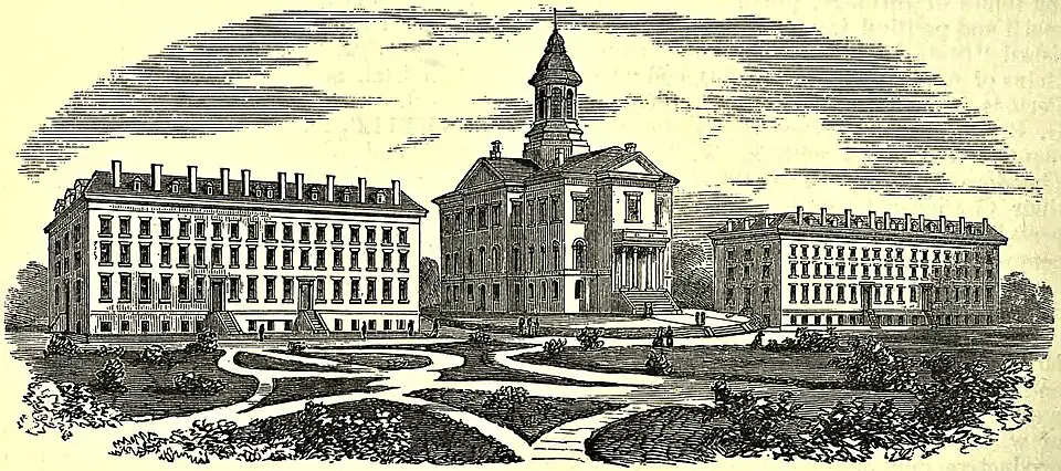 LEWISTON, a city of Androscoggin co., Maine, on the E. bank of the Androscoggin river, opposite Auburn, with which it is connected by four bridges, and on the Lewiston and Androscoggin divisions of the Maine Central railroad, and the Lewiston and Auburn branch of the Grand Trunk line, 36 m. N. of Portland, and the same distance S. W. of Augusta; pop. in 1850, 3,584; in 1860, 7,424; in 1870, 13,600, of whom 3,008 were foreigners; in 1874, about 20,000. Its importance is chiefly due to its water privileges, which are among the best in New England, now applied to a great variety of machinery, involving large manufacturing interests. The river breaks over a diagonal ledge of rocks, and falls more than 50 ft. in a distance of 200 ft. The natural advantages thus furnished are increased by stone dams extending across the river, and by a canal 60 ft. wide reaching from above the falls to the mills. The conformation of the ground is such that the water may be used several times. The Franklin company, incorporated in 1854, with a capital of $1,000,000, owns the water power, canals, and other real estate, and rents to other companies. It also owns the Lincoln mill, which produces fine cottons and jeans. Including the Franklin company, there are nine corporations engaged in the manufacture of cotton and woollen goods, with an aggregate capital of $7,750,000, employing 20 sets of woollen machinery and about 270,000 spindles. The principal kinds of goods made are sheetings, shirtings, cassimeres, repellants, ginghams, cottonades, quilts, beavers, ladies' cloakings, tweeds, tickings, duck, twine, and jute bags. The number of hands employed in the mills is about 8,300 (3,800 males and 4,500 females), and the annual product is 37,000,000 yards of cloths and 3,000,000 bags. The Lewiston bleaching and dye works have a capital of $300,000, and employ 280 hands. The Lewiston machine company produces cotton and woollen machinery. The other principal manufactures are of boots and shoes, bricks, carriages, sash, doors, and blinds, furniture, and lumber. The total annual value of the manufactures is about $11,500,000. There are a national bank with $400,000 capital and two savings banks. The city is divided into seven wards, and is governed by a mayor, a board of aldermen, and a common council. It is lighted with gas, and has a handsome city hall. Lewiston is the seat of Bates college, under the control of the Free Baptists, which was established in 1863 and named in honor of Benjamin E. Bates of Boston, who contributed $200,000 to its endowment. It has handsome grounds, three fine college buildings, and a president's residence. A theological department, occupying a four-story brick building about ¼ m. from the grounds, was organized in 1870. In 1873-'4 this institution had 10 professors (4 in the theological department) and 2 tutors, 122 students (19 theological), and 8,300 volumes in its libraries, viz.: college library, 4,500; theological, 2,200; societies', 1,600. The Nichols Latin school, named in honor of Lyman Nichols of Boston, near the grounds, is owned by the college and maintained as a preparatory school; in 1871-'2 it had four instructors and 68 students. The city has excellent graded schools, including high and normal departments, attended by about 2,000 pupils. There is a public library of 6,000 volumes, established by the corporations. A daily and two weekly newspapers and a monthly periodical (by the college students) are published. There are 11 churches, viz.: Baptist, Congregational, Episcopal, Free Baptist (3), Methodist (2), Roman Catholic (2), and Universalist.—Lewiston was settled in 1770, and incorporated as a town in 1795. In 1861 a city charter was granted, but the city government was not organized till 1863.