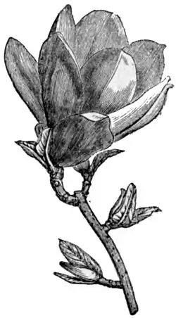 Several of the exotic species are common in cultivation, while others, at the north at least, are only greenhouse plants; some botanists have placed these in separate genera, but they are proper magnolias. The best known of these is the Yulan (M. conspicua), a Chinese name signifying lily tree, which is often met with as a shrub flowering when only 3 or 4 ft. high, but which grows to a handsome tree of 30 to 50 ft.; the flowers, which appear in early spring (April), before the leaves, are large, white, and fragrant; the leaves are obovate, pointed, and downy when young; the fruit, by the suppression of some of the carpels, is often contorted into most grotesque shapes. This tree is quite hardy in a much colder climate than that of New York, and for its large, early, fragrant flowers is a favorite with many, while others object to it on account of its naked appearance when in flower; there is a celebrated specimen near Newburgh, over 30 ft. high, symmetrical in form, and when in bloom its flowers are estimated by thousands. It is a great favorite with the Chinese, who dwarf it, as they do other trees, by cramping the roots in small pots. A row of seedlings of this magnolia presents a great variety in foliage, and some of these are retained in cultivation under distinct names. The purple magnolia (M. purpurea) is a native of Japan; in cultivation it seldom reaches above 10 ft.; it has the same habit of early flowering with the preceding species; the large flowers are pinkish purple outside and white within; the leaves are of a bright dark green; it is somewhat less hardy than the preceding, and in cold localities is treated as a greenhouse plant. Soulange's magnolia (M. Soulangeana of the nurseries) is a hybrid between the two just noticed; the tree has the habit and hardiness of M. conspicua, while the purple tinge in the petals shows its relationship to M. purpurea. Lenne's magnolia, of comparatively recent introduction, is supposed to be a variety of M. purpurea, from which it differs in its finer foliage and larger and more deeply colored flowers. Several other species or varieties of this group are in cultivation, but their value remains to be ascertained. There are a few other exotic species, but they are rare in our gardens. Campbell's magnolia (M. Campbellii), of the Sikkim Himalayas, is described as a large tree with fine foliage, and crimson and white flowers rivalling those of M. grandiflora in size and exceeding them in beauty. M. Kobus and M. obovata are Japanese species grown in greenhouses. M. fuscata is a small evergreen shrub with much the appearance of a camellia; its brown stems are hairy, and its flowers, which are brownish red or purple, are exceedingly fragrant; the French call it the black-wooded magnolia on account of the dark color of its wood. This species grows in the open air in Georgia and other southern states, where it is highly prized for its fragrance, and is generally known as the banana shrub; it there forms a dense bush 8 or 10 ft. high. — The magnolias are readily raised from seeds, which germinate better if sown as soon as ripe; if they are to be kept till spring, they must be preserved in slightly damp sand, for if allowed to become perfectly dry they will not germinate. The difficulty of removing wild trees has already been alluded to; they form but few fibrous roots, and hence are usually looked upon by nurserymen as plants very difficult to handle; but if nursery-grown plants are frequently transplanted during their growth, fibrous roots are formed, and they can be removed with safety; in some nurseries the trees are grown in pots, and these, though necessarily small, are quite safe for the planter to purchase, as they may be turned into the open ground without disturbing their roots. Magnolias are also multiplied by layers, but the tall-growing ones thus treated never produce handsome-shaped trees, and those from seed are preferable. The rarer kinds, especially the Chinese, are grafted upon some species which grows readily from seed, the cucumber tree (M. acuminata) being usually selected as the stock upon which to graft. Inarching is also sometimes resorted to to multiply these plants. (See Grafting.)