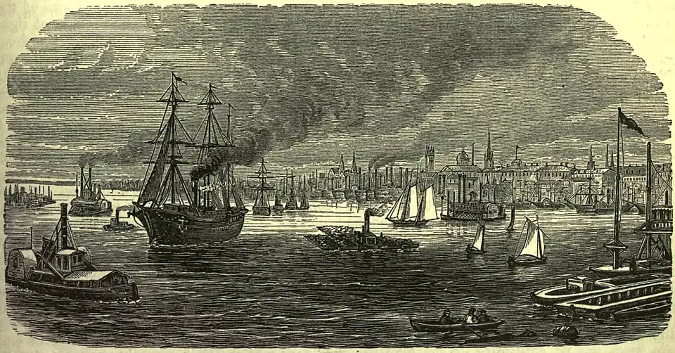 The river here has a general E. and W. direction. The older portion of the city is built on the left bank, on the convex side of a bend of the river, from which circumstance it derives its familiar sobriquet of the “Crescent City.” In the progress of its growth up stream, it has now so extended itself as to follow long curves in opposite directions, so that the river front on the left bank presents an outline somewhat resembling the letter S, and 11 or 12 m. in extent. The city includes, on the left bank, the town of Carrollton, formerly belonging to the parish of Jefferson, and the whole of the parish of Orleans, except the portion lying between Bayou Chef Menteur and the Rigolets pass; and on the right bank, the town of Algiers. The greater portion of this region is not built up, but consists of market gardens, swamps, canebrakes, and bayous. The boundaries of the city on the left bank are: on the west, the upper line of Carrollton and the line of the old Jefferson and Lake railroad; on the north, Lake Pontchartrain; on the east, Bayou Chef Menteur; and on the south, Lake Borgne, Bayou Bienvenu, Fisher's or Fisherman's canal, and the Mississippi. On the right bank, Algiers is bounded N. E. by the Mississippi river and by the line of Ptolemy street, running southeasterly (nearly as a continuation of Canal street on the left bank), and by other lines zigzagging more easterly, and terminating at Point Becka on the Mississippi. That portion of the parish of Orleans which alone has not been included in the city consists of a series of islets called Les Petites Coquilles, from the extent to which small shells enter into the composition of their soil. These islets surround a body of water from Lakes Pontchartrain and Borgne which is called Lake Catharine. At the Pontchartrain end of the Rigolets pass, on one of these islets, stands Fort Pike; on another, at the Lake Borgne end of the Rigolets, stands Fort Macomb. Near the western border of Bayou Chef Menteur stands Fort Wood. Fort Pike is in lat. 30° 10' N., lon. 89° 38' W., about 30 m. from the centre of the drainage sections of the city. Fort Wood is in lat. 30° 8' N., lon. 89° 51' W. Fort Macomb is about 6 m. S. E. of Fort Pike, and is virtually if not actually abandoned. Fort Pike, being surrounded by salt water, is healthy, while Fort Wood, standing in the midst of marshes, is very insalubrious. From the western boundary of the city to the northeastern (that is, from Carrollton upper line to Bayou Chef Menteur) the distance is about 22 m.; greatest breadth, at the N. E. extremity, nearly 10m.; breadth from the lake to the river, in the drainage sections, 7½ m.; least breadth, from Lake Pontchartrain to Bayou Bienvenu, about 5 m.; total area of the present statutory city, about 150 sq. m. The actual city, however, is comprised within the drainage sections, of which not more than one half is closely inhabited, while the other half comprises much that is but barely redeemed from original swamp. These sections cover an area of 26,026 acres, or about 40⅔ sq. m. They are bounded by lines which have been run for a contemplated protection levee, and by the river. The W. line is the upper line of the city from the river to the lake, a distance of nearly 5¼ m.; the N. line skirts the shore of the lake for nearly 4½ m.; the E. line is irregular, running from the lake to the river, a total distance of about 7¾ m. It is proposed to make this protection levee sufficiently broad at the top to form a good road. On the lake shore considerable progress has already been made, the levee along the river having long since been built. The region enclosed by these lines is lower than the surface of the Mississippi at high water, and besides has a slight general declination toward the lake. Somewhat further back than its centre it is crossed by an irregularly curved ridge, called the Metairie ridge on the W. side of the bayou St. John, and the Gentilly ridge on the E. side. Along these ridges run a bayou and a road bearing the same name, but the bayou Gentilly is better known, at least in its eastern course, as the bayou Sauvage, the name originally given to it. The bayou St. John, running southerly, from about the centre of the protection levee line along the lake, for a distance of nearly 4 m., is continued by the Carondelet canal some 2 m. further in a southeasterly direction to what is known as the Old basin, which stands at the end of Toulouse street, at a distance of about half a mile from the river. About two fifths of a mile from the W. extremity of the lake protection line the New Orleans canal, generally called the New canal, starts parallel to the bayou St. John, and runs S. and S. E. about 6½ m. into what is known as the New basin at the end of Julia street, about three quarters of a mile from the river. Connected with these bayous and canals are a number of others by means of which the city within the limits we are considering is drained. Many new ones are contemplated, several have lately been constructed, old ones have been lengthened, deepened, and otherwise improved, and some useless or objectionable ones have been filled up. By the bayou St. John and the New canal small vessels bring large quantities of articles from Mobile, Pensacola, the lake shores, and their vicinities. These are, besides some cotton, principally lumber, shingles, sand, shells, bricks, tar, oysters, wood, charcoal, fire clay, and garden produce. As many as 50 or 60 vessels have been seen in the basins at the same time. Some of these are large schooners, and a few small stern-wheel steamboats have plied among them. North of the Metairie bayou, near the western protection levee line, was the famous Metairie race course; and south of the bayou, somewhat nearer the levee line, is the Oakland race course. On the same ridge, between the New canal and the bayou St. John, somewhat nearer the latter, is the old city park. Here are numbers of fine large oaks and other 