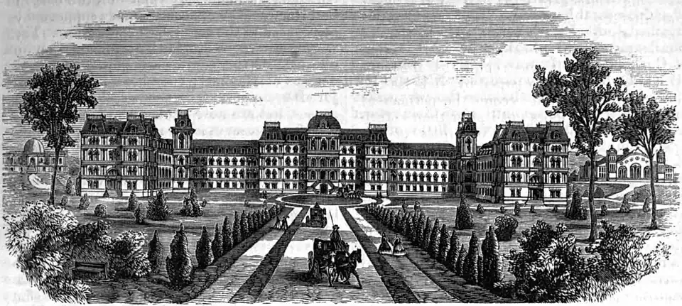 VASSAR COLLEGE, an institution of learning near Poughkeepsie, N. Y., founded by Matthew Vassar for the advanced education of young women. The founder was born in Norfolk county, England, April 29, 1792, and in 1796 came to the United States with his father, who settled on a farm near Poughkeepsie. The father engaged in brewing, in which his son subsequently accumulated a large fortune. In February, 1861, Mr. Vassar delivered to trustees, incorporated for the purpose by the legislature in the preceding January, $408,000 for the founding of Vassar female college, accompanying the gift with a statement of his wishes concerning the plan of the college and its system of instruction. About half of this sum was to be expended in the erection of buildings, for which he gave a beautiful site of 200 acres nearly two miles E. of Poughkeepsie and a little greater distance from the Hudson river, and the remainder to form an endowment for the partial support of the professorships, &c. It was not his purpose to make it a charity school, but to afford to women opportunities for obtaining a collegiate education at moderate cost, and gratuitous instruction to those unable to pay for it. All sectarian influences were to “be carefully excluded, but the training of our students should never be intrusted to the skeptical, the irreligious, or the immoral.” Mr. Vassar died June 23, 1868, and left a bequest of $50,000 to constitute a lecture fund, the income to be used in maintaining, without extra charge to the students, lectures on literature, science, and art; $50,000 as a library, art, and cabinet fund; and $50,000 as an “auxiliary fund for aiding students of superior promise and high scholarship, who are unable to pay the full charges for board and tuition in the college.” The construction of the main college building was completed in 1865. It is of brick with blue freestone trimmings, 500 ft. in length, with a breadth at the centre of 200 ft., and at the transverse wings of 164 ft. The central building and the wings are five stories high, and the connecting parts four stories. Within the edifice are five independent dwellings for resident officers, accommodations for about 400 students, recitation and lecture rooms, a chapel, and apartments for a library and reading room, philosophical apparatus, laboratories, &c. Apart from the main edifice are an observatory and a spacious museum, containing an art gallery, a studio, cabinets of natural history, a lecture room, music rooms, a hall for literary societies, a hall for calisthenics, and a bowling alley.