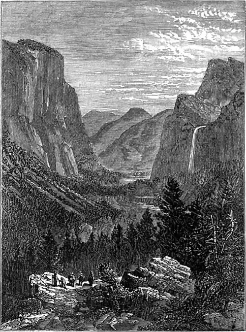 It is nearly in the centre of the state N. and S., and just midway between the E. and W. bases of the Sierra Nevada, here a little more than 70 m. wide. It is nearly level, about 6 m. long by ½ m. to 1 m. wide, and nearly a mile in perpendicular depth below the general level of the adjacent region. Its general direction is N. E. by E. and S. W. by W., nearly at right angles with the general trend of the mountains; its elevation above the sea is 3,950 ft. Its granite walls are nearly vertical; their color is a light gray, reflecting brilliantly white in the sunlight, occasionally varied with veins of a brighter or deeper hue. In places stripes of a darker color, gray, brown, and black, are produced by the flowing down of water carrying organic matter. Various species of trees and plants occur in the valley. In winter it is inaccessible, except on snow shoes; in summer the nights are cool, but the thermometer almost always rises above 80° in the middle of the day in June and July. There are several hotels for the accommodation of tourists. The valley is reached by stage or stage and horseback (about 90 m.) from Merced, Milton, and Oakdale, on branches of the Central Pacific railroad. The principal objects of interest will be described proceeding up the valley. The first on the right is the Bridal Veil fall, formed by a creek of the same name, which is precipitated over the cliffs in one leap of 630 ft. perpendicular upon a slope, down which it rushes in a series of cascades for a perpendicular distance of nearly 300 ft. The effect from the valley is as of a vertical fall of 900 ft., the base being concealed by trees. The column of water sways to and fro in the wind, seeming in the distance to flutter like a white veil. A little higher up is Cathedral rock, a prominent and massively sculptured pile of granite, the summit of which is 2,660 ft. above the valley. Above this are the “Spires,” isolated columns of granite at least 500 ft. high, standing out from, but connected at the base with, the walls of the valley. Still further up a point of rocks projects into the valley, terminating in a slender mass of granite somewhat resembling an obelisk. This is known as Sentinel rock. Its entire height is 3,043 ft.; the obelisk form continues down for 1,000 ft. or more from the summit, below which the rock is united with the wall of the valley. A short distance above is Glacier point, from which one of the finest views in the valley may be obtained. Back of Sentinel rock is Sentinel dome, 4,150 ft. above the valley, which commands a fine view of the Yosemite fall. On the left side of the valley, opposite the Bridal Veil fall, is the Virgin's Tears fall, where the creek of that name leaps over the wall more than 1,000 ft. Just above is El Capitan, an immense block of granite projecting into the valley and presenting an almost vertical edge 3,300 ft. high. Further up, and nearly opposite Sentinel rock, are the Three Brothers, a group of rocks rising one behind another, the highest being 3,830 ft., and from its summit affording a splendid view of the valley and surroundings.
