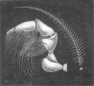 sensitive organs of touch, or some analogous sense, which inform the animal of the presence, and perhaps of the nature, of objects within reach. At the same time I remarked that the outer foot-jaws (pedipalps) were employed alternately in making casts, being thrown out deliberately, but without intermission, and drawn in, exactly in the manner of the fringed hand of a Barnacle, of which both the organ and the action strongly reminded me. I looked at this more closely with the aid of a lens: each foot-jaw formed a perfect spoon of hairs, which at every cast expanded, and partly closed. That you may understand this better I must say, that the foot-jaw resembles a sickle in form, being composed of five joints, of which the last four are curved like the blade of that implement. Each of these joints is set along its inner edge with a row of parallel bristles, of which those of the last joint arch out in a semi-circle, continuing the curve of the limb; the rest of the bristles are curved parallel or concentrical with these, but diminish in length as they recede downwards. It will be seen therefore that when the joints of the foot-jaw are thrown out, approaching to a straight line, the curved hairs are made to diverge; but as the cast is made, they resume their parallelism, and sweep in, as with a net, the atoms of the embraced water.