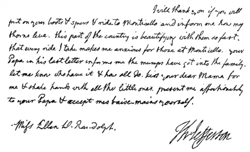 Back at Monticello, Jefferson was wont to spend his entire mornings in his shops, among his vegetables and flowers, and out about his farms. "I talk of my plows and harrows, of seeding and harvesting, with my neighbors, and of politics, too, if they choose to." Advice on public matters, though, was not always forthcoming, "I turn with great reluctance from the functions of a private citizen to matters of State. The swaggering on deck as a passenger "My dear Ellen,