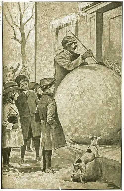 The next morning, when the children assembled at school, they saw a strange sight. On the front steps of the building was a great snowball, so large that it almost hid the door from sight And working at it, trying to cut it away so that the entrance could be used, was the janitor. He was having hard work it seemed.