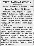 Wichita, Kansas; August 16, 1930 (Associated Press) "Eddie" Schneider, eighteen-year-old Westfield (New Jersey) youth, attempting to establish a new junior transcontinental flight record, arrived here tonight at 7:45. He had left St. Louis at 1:25 p.m. Schneider was delayed in his arrival here by a severe wind and rain storm. It was thought for a time he had been forced down. He had been delayed in taking off from St. Louis by low visibility and threatening storms. The Junior flier's elapsed time from Westfield to Wichita was 14 hours and 58 minutes.