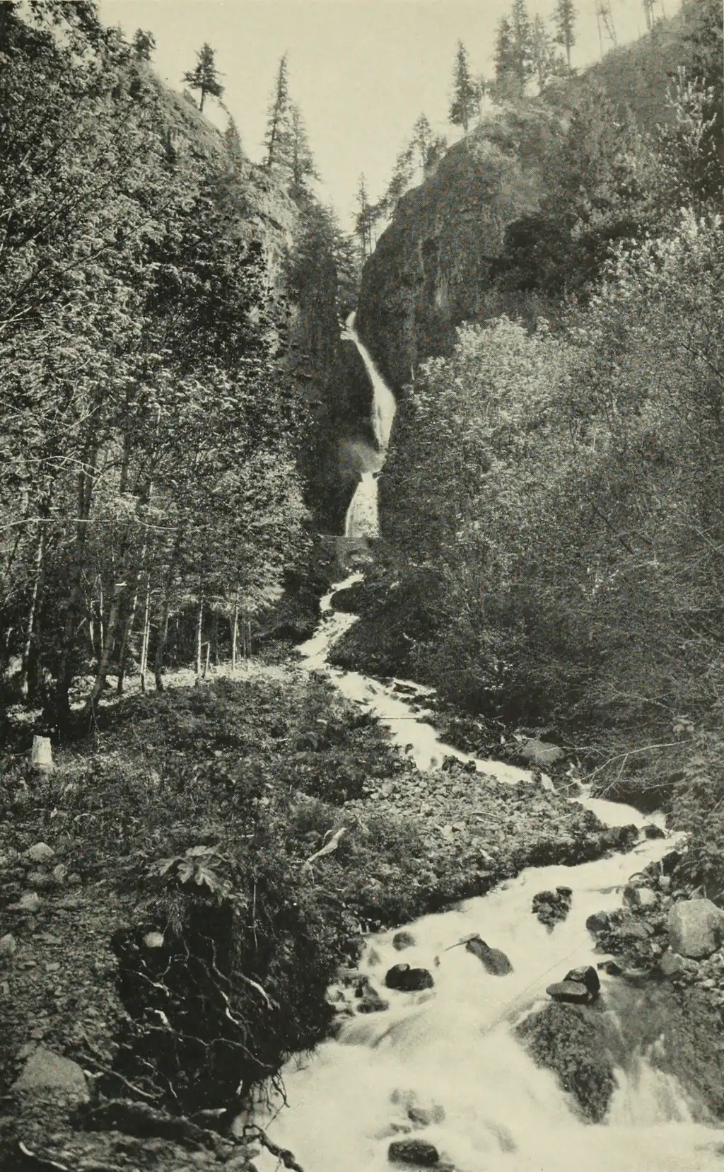 Standing at the margin of the river and looking up along the sky line, one sees the rim rock of the mountain, in many places, thousands of feet above. The crystal waterfalls, the great trees, the fresh green moss— the rocks themselves, speak of eternal youth, and it seems but yesterday that the hand of God fashioned it all.