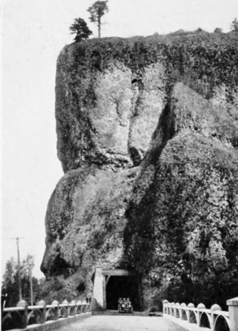 The Columbia River Highway encircles the top of the rock which is seen on the right.