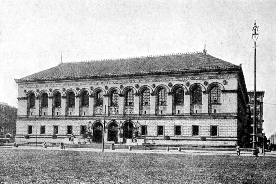 The First Free Public Libraries in America. — It is almost impossible to determine the identity of the first library in the United States supported by public funds and wholly free to its users. The earliest recorded gift of books to a municipality is that of the Rev. John Sharp who bequeathed, in 1700, his library to the city of New York for the benefit of the people. This has disappeared, as has another collection founded in 1803 at Salisbury, Conn. The Town Library at Peterborough, N. H., founded through the efforts of Rev. Abiel Abbot in 1833, appears, from the data at hand, to have been the first free library which has continued to the present. This, however, was essentially a local development, and the movement in its larger aspects was probably initiated by the enactment of a law in 1848 enabling Boston to establish a free public library. In 1851 this was extended to the whole State. The Boston Public Library is thus one of the first American free public libraries in time and for many years it was the first in importance, taking second place only to the New York Public Library after the merger of its various foundations, the New York Public Library (q.v.) becoming thereby the greatest institution of the kind in the world. This primacy of the Boston Library comprehended not only the extent and scope of its collections, but also building, librarians and general cultural activities. The first home of the library, built according to the discarded alcove plan, was nevertheless for many years the most imposing public library building in the country, a position that was regained when the new structure was erected at Copley Square in 1895, at a total cost of $2,750,000. This beautiful Renaissance building, with its mural decorations by Abbey, Sargent and other distinguished artists, was the forerunner of the great library constructions of to-day, few of which have surpassed it in dignity and fitness. The Boston Public Library has 30 branches and contains collections totalling 1,157,326 volumes.