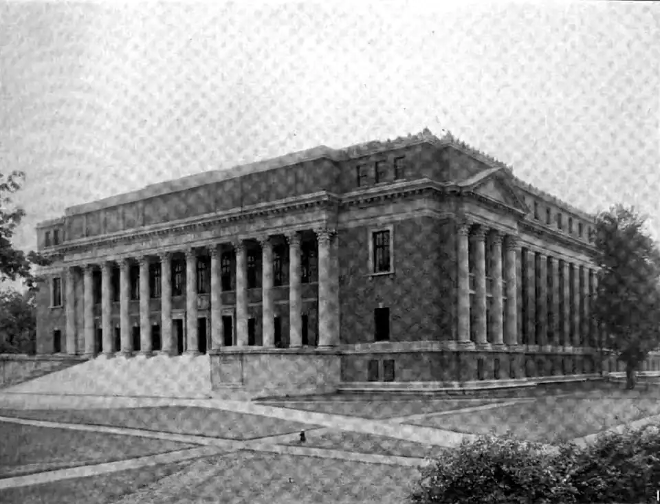 To sum up, the æsthetic requirements of a library are satisfied by a construction marked by taste, dignity and repose, with no excess of decoration and ornamentation. In fact, warmth, homelikeness and restfulness are the characteristics that good psychology would recommend for a building dedicated to the conservation and distribution of knowledge. Should these principles be adhered to there can be no doubt that a purely library type of architecture will develop, if it has not already done so. Like the modern skyscraper, the library will find a type of construction all its own, sufficiently lovely and none-the-less a library. To gain this end, only one thing is necessary: to plan libraries from within, for all beautiful buildings became such because first of all they were fit. From the viewpoint of interior efficiency the following are the minimum requirements: (1) Sufficient floor space; (2) compactness; (3) light; (4) heat and ventilation; (5) storage. 1. Floor space. The amount of floor space assigned to the various departments will necessarily depend upon the nature of the library, but taking the public library as the norm, the assignment of floor space would average as follows: Reading-room, delivery-room, etc., 50 per cent; administration, 20 per cent; lecture hall, 10 per cent; stack, 20 per cent. There will of course be variations, particularly with regard to the stacks, which of course expand more rapidly and easily than the other groups. 2. Compactness. This is closely related to the preceding requirement, and means that the library be planned for economical administration. What is known in military science as “interior lines of communication” should be adhered to, so that the various processes in handling the book will link up without loss of space or time. Every step that is wasted and every needless operation caused by constructional exigencies stamp the building as faulty to that degree. All portions of the building from the basement to the attic should be available, and waste spaces formed by unnecessary passages and stairways should be avoided. 3. Light. The eye is the organ used almost exclusively in a library, hence the illumination should be abundant in quantity and diffused in quality. Therefore any form of construction that decreases light, such as overhanging porticoes, massive walls or dark tones in decoration, are distinctly bad. Direct sunlight and glares are bad, but otherwise there is little danger of too much light. This applies equally to artificial lighting, which should be supplied by electricity where available. Indirect systems of illumination are considered preferable, but they are not economical, and certainly are not recommended for stacks and situations requiring concentration of light. 4. Heat and Ventilation. Mental work is most efficiently performed where the temperature is neither too warm nor too cool, 68° to 70° Fahrenheit, and where there is an abundance of fresh air, without drafts. In general the direct-indirect method of heating appears to be the most satisfactory, for by means of it not only is the building heated but it is also supplied with fresh air. Furthermore the space-wasting and unsightly radiators are avoided, air-ducts in convenient positions in the walls or at positions being substituted. There should, of course, be ventilating exits for impure air and, in addition, some libraries use forced or artificial ventilation. Such a system has its advantages, but it is expensive to install and to maintain, and in certain cases has not been wholly a success. It might, however, be used to advantage in the reading-rooms and other assembly halls. The nature of the collections and the uses to which they are put will necessarily have a determining effect upon the type of building demanded. Thus, for instance, a special or associational library will require different arrangements from a public library, and the public library from a university library. For a technical collection, a small reference library or university seminar collection, the alcove system has very decided advantages, which disappear, however, as soon as the collection exceeds, say, the 50,000-mark. These points apply, though with less force, to theological, medical and law libraries. The latter, in particular, requires special treatment, for a law library is a reference library in the strictest sense, not partially but as a whole. The entire collection, sometimes very extensive, should be immediately accessible. In many cases, such as that of the Social Law Library, Boston, the problem has been solved by placing the stacks down one side of a long apartment, the other side of the room being arranged for readers, who have direct access to the books on the shelves. A similar arrangement would be satisfactory for the larger medical, technical and scientific libraries. Theological, historical and document collections, partaking more of the characteristics of general libraries, could make use of stack system. General reference libraries are subject to the conditions determining any library building, yet there are certain differences that require special attention. The university library is perhaps the best type of this class. This has some very special problems that influence the construction of the building. One of these is the necessity for making it conform with the other buildings in the academic group, for more and more the universities are planning all new buildings according to predetermined architectural styles. The necessity for conformity on the part of the library could conceivably result in an unsatisfactory building, unless great care were taken in its design. Another serious problem of the university library is the necessity for providing for the special collections demanded by the different academic departments. In some institutions the university library is little more than a collection of separate special libraries, the general library containing only a minorit