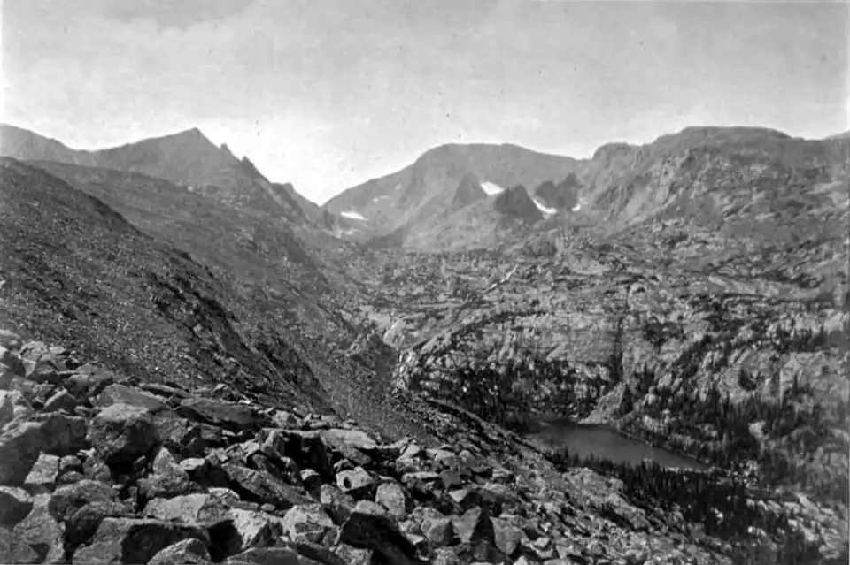 In the centre of Bighorn Mountains—Cloud Peak highest summit in distance. Granite rocks sculptured by glacial action