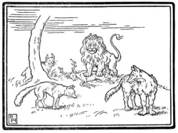 he Lion went once a-hunting along with the Fox, the Jackal, and the Wolf. They hunted and they hunted till at last they surprised a Stag, and soon took its life. Then came the question how the spoil should be divided. "Quarter me this Stag," roared the Lion; so the other animals skinned it and cut it into four parts. Then the Lion took his stand in front of the carcass and pronounced judgment: "The first quarter is for me in my capacity as King of Beasts; the second is mine as arbiter; another share comes to me for my part in the chase; and as for the fourth quarter, well, as for that, I should like to see which of you will dare to lay a paw upon it."