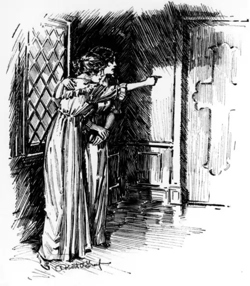 “Stop, Mr. Brett!” exclaimed Eleanor, who, with Douglas and the coroner, had sat too astounded to speak during the rapid colloquy between the two men. “You forget that the door to the southwest chamber occupied by Annette was locked on the inside and that door was the only means of entering the room. It is only fair to you, Captain Lane”—turning courteously to the young officer—“to remind Mr. Brett of the very obvious fact that no one could have entered the sleeping woman's room, blown out the light, and, on leaving the room, locked and bolted the door on the inside leaving the key in the lock.”