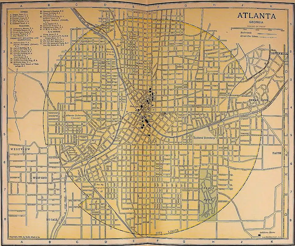 Population: 1850, 2,572; 1870, 21,789; 1890, 65,533; 1900, 89,872, including 2500 persons of foreign birth and 35,900 of negro descent. The first settlement was made here about 1839, and was called Terminus, from its being the intended terminus of the Georgia Railroad, completed in 1845. In 1843 it was incorporated as a town under the name Marthasville, and two years later the present name was adopted, while in 1847 a city charter was secured. Atlanta's growth was very rapid, its population being about 15,000 in 1861, and, from its admirable location, it became, at the outbreak of the Civil War, one of the most important cities in the Confederacy, being used as a depot for supplies, a manufacturing centre, a shelter for refugees, and a rallying-place for recruits. In 1864 it was the objective point of General Sherman's campaign from Chattanooga (See Civil War in America.) The Federal army approached the city in July, and after fighting the battle of Peachtree Creek (q.v.), on July 20, closely invested the Confederate works. On July 22 the battle of Atlanta was fought southeast of the city. Hood, the Confederate general in command, making a bloody but unsuccessful attack on Sherman's extreme left under McPherson, who was killed early in the engagement. The Federal loss in killed, wounded, and prisoners was about 3500; the Confederate, never accurately determined, was probably as great as 8500. On the 28th another severe engagement, the battle of Ezra Church, was fought west of the city. Hood again attacking, and being again repulsed, the Federals losing about 600 and the Confederates about 4500. Meanwhile Sherman had kept up an almost continual bombardment, and on September 1, by a flank movement, compelled Hood to evacuate, the Federals taking possession on the following day. On the 4th, Sherman ordered all civilian residents to leave Atlanta within five days, and at the end of that time turned the city into a vast military camp. Here he stayed until November 15, when, leaving the larger part of the city in flames, he started for Savannah, on his famous march to the sea. Excepting its court house, churches, and a number of dwellings, Atlanta was almost totally destroyed; but after the war it was quickly built up anew, and grew with great rapidity. In 1878 it became the capital of Georgia, and in 1895-96 the celebrated Cotton States and Industrial Exposition was held here. For Atlanta during the Civil War, see Jacob D. Cox, Atlanta (New York, 1882), in the “Campaigns of the Civil War Series.” For the general history of the city, see W. P. Reed (editor), History of Atlanta (Syracuse, 1889).